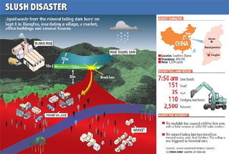 Updated: 2008-09-12 07:35 Rescuers Thursday were still searching for people missing after hundreds of thousands of tons of liquid iron-ore waste flowed downhill from a mine's dump in Shanxi province, as the death toll rose to 151. The Tashan Mine iron-ore waste dump's wall broke on Monday, causing a massive landslide that buried an entire village and a market in Xiangfen county. The dump was about to burst its banks on Monday after being filled to more than capacity, and rain precipitated the process. Shanxi provincial government secretary-general Wang Qingxian denied claims on the Internet that hundreds of people were missing after the landslide.
