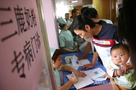 Parents take their children, who took Sanlu milk powder, to Nanjing Children's Hospital for medical treatment and checkup in Nanjing, capital of east China's Jiangsu Province, September 14, 2008. From September 13, the hospital set up a special team made up of experts to treat the babies suffering from kidney stones after taking tainted Sanlu milk powder. [Asianewsphoto]