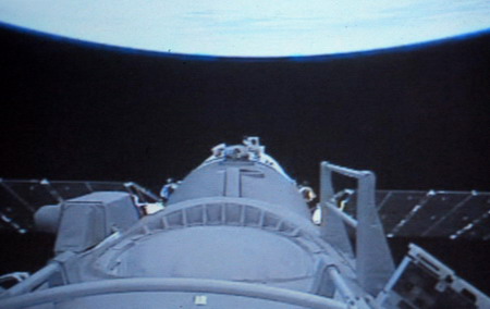 This video grab taken on September 26, 2008 shows the view outside the Shenzhou VII spacecraft captured by a camera placed outside of the spacecraft. It has been functioning well since the blastoff at 9:10 pm Thursday. [CFP]