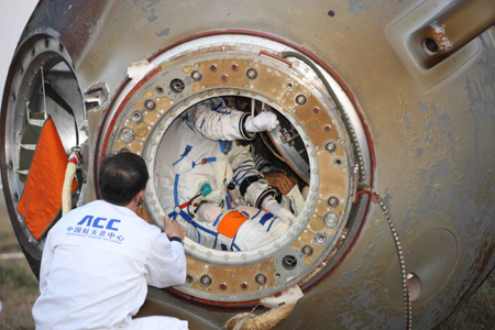 A technician helps the astronauts out of the re-entry capsule of China's Shenzhou VII spaceship after it landed by parachute in North China's Inner Mongolia Autonomous Region, September 28, 2008. [Xinhua]