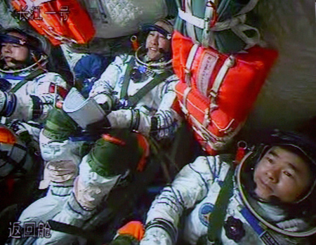 In this video grab from China Central Television, the three Chinese astronauts are seen inside the re-entry capsule of the Shenzhou VII spaceship before returning to the earth, September 28, 2008. [Xinhua] |