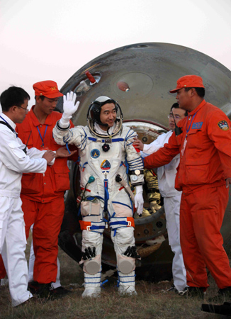 Chinese astronaut Zhai Zhigang waves his hand after the successful landing of the re-entry module of the Shenzhou VII spaceship in North China's Inner Mongolia, September 28, 2008. [Xinhua] |