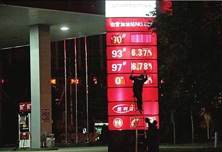 A staff changes the price tags at a PetroChina gas station in Beijingat midnightOctober 7, 2008. Beijing raised the prices of refined oil products by up to 4 percent on Tuesday to cover the cost of cleaner fuel. [Xinhua]