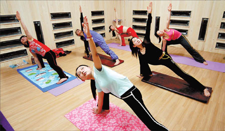 "Most of the people who join us for the group dancing sessions suffer from chronic diseases that need a certain amount of exercise as treatment," says Gao Ning's mother Gao Xiaohua, who suffers from allergic pneumonia. "It's a place for us to kill time, too." The senior Gaos prefer the public park to the gym because fitness clubs, which first appeared in the 1990s, are too extravagant for most of the elderly people. "Paying 1,000 yuan ($146) a year as club fees is a waste of money," says Gao Xiaohua. "Besides, we don't need that tough exercise routine." But the very concept of physical exercise has changed for many Chinese who have grown up during the past couple of decades when the country's economy grew by leaps and bounds. Gao Ning, a mid-level manager in a machinery company, says stress caused by work and the hours spent on Beijing's clogged roads forced him to join Hosa Gym, which has 28 branches in the capital's business district. "I feel relaxed and sort of reborn after a work-out," he says. "Without it my days are gloomy and I feel tired." Gao Ning and Huang Xiaoying make about $30,000 a year, and pay $200 each annually for their gym membership to get personal trainers for an hour a day. "It's money well spent," Huang says. "After you get all the necessities, money, job and a house, you realize how important health is. Without health, nothing is meaningful." On most weekday nights, the gym is packed with young professionals sweating it out on stationary bicycles, swimming or practicing yoga. The gym has been doing good business, says a manager surnamed Zhou. About 1,000 new gyms have been opening in China every year during the past few years. With 30 new gyms and fitness clubs coming up every year, Beijing has seen a boom in the fitness business. And then there are people who visit spas for full-body or foot massage, or aromatherapy. These spas are run by hotel chains, other organizations and even mom-and-pop establishments. But despite all this, the modern idea of fitness remains an urban, middle-class craze. A survey, conducted by a team of the Tianjin Institute of Physical Education, led by researcher Shao Xuemei, shows the awareness and willingness of taking to sports and exercise varies among people of different social strata. Government officials, factory workers and professionals are the three groups most frequently engaged in sports, according to the survey that covered more than 5,000 people in nine cities across the country. Government officials usually take to sport because they are the most aware of the benefits of physical fitness, says Shao. Factory workers engaged in sport either as recreation or as a means to keep fit. About 5 percent of the urban people - the relatively well-off, including managers, and those working for commercial or tertiary industries - join health clubs to keep fit, according to the survey. The proportion of those who pay to exercise is the highest among private entrepreneurs group, with 11 percent of them doing so. But they are the most inconsistent group when it comes to workouts, too, because of their busy schedule.