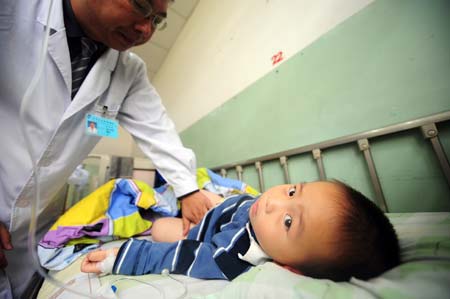 A doctor gives medical examination to a child with kidney diseases at the Gansu Maternity and Child Health Care Hospital in Lanzhou, capital of northwest China's Gansu Province, Sept. 18, 2008. [Xinhua]