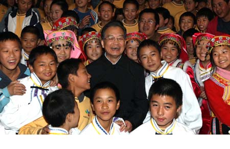 Chinese Premier Wen Jiabao (C) poses for a group photo with students of the Beichuan Middle School, Mianyang City, Southwest China's Sichuan Province, November 15, 2008. [Xinhua]