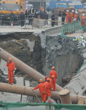 "The chances of survival are slim because of heavy flooding," Chen Yunmin, professor of the architecture department of Zhejiang University, and a member of the rescue team, said. Experts have arrived at the site to determine the cause of the accident. Zhao Tiechui, vice-minister of the State Administration of Work Safety said yesterday: "The cause of such accidents should be investigated thoroughly, and the findings made public." He said if the construction company was at fault, it will be severely punished. A person living nearby, who declined to give his name, told China Daily that cracks had appeared on the road surface two or three months ago. The cracks, more than 10 m in length and 2 cm in width, had alarmed residents. Hangzhou has launched a citywide check of all its 35 subway construction sites. They have been ordered to shut down temporarily. The 69-km project, begun in March last year, is being built at a cost of $5.1 billion and is due to be completed in 2011, Xinhua said. Local authorities have arranged accommodation for the relatives and friends of the dead and missing. Compensation will also be announced soon, officials said. |