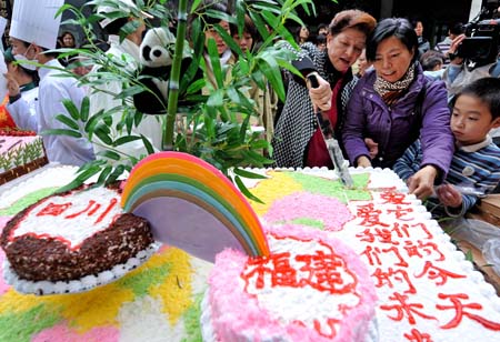 Local people cut a cake for a giant panda in Fuzhou, east China's Fujian province, December 28, 2008. Fuzhou residents held a happy New Year party on Sunday for the giant andas transferred to Fuzhou from Sichuan Province after the disastrous May 12 earthquake. [Xinhua]