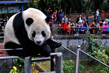 A giant panda plays in the Panda World in Fuzhou, east China's Fujian province, December 28, 2008. [Xinhua]