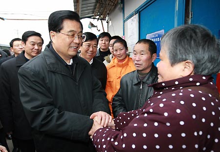 Chinese President Hu Jintao (L Front) shakes hands with a woman as he visits residents of the Xingfu Community in Dujiangyan City, southwest China's Sichuan Province, Dec. 28, 2008. President Hu Jintao visited quake-hit Sichuan Province on December 27-29, showing concern for survivors and inspecting reconstruction work. [Xinhua]