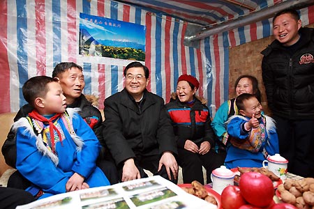 Chinese President Hu Jintao (3rd L) smiles as he talks with family members of Ma Xizhi (2nd L) at Caijiagang Village of Xuankou Township in Wenchuan County, southwest China's Sichuan Province, Dec. 29, 2008. President Hu Jintao visited quake-hit Sichuan Province on Dec. 27-29, showing concern for survivors and inspecting reconstruction work. [Xinhua]