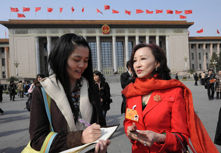 Zheng Mingming, member of the Chinese People's Political Consultative Conference (CPPCC), is interviewed after the closing ceremony of the first session of the 11th National Committee of the CPPCC in Beijing on Friday, March 14, 2008. [Xinhua]
