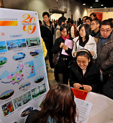 A college student talks with a company employee at a job fair at Hangzhou Peace International Convention and Exhibition Center in Hangzhou, east China's Zhejiang province January 13, 2009. [Xinhua]