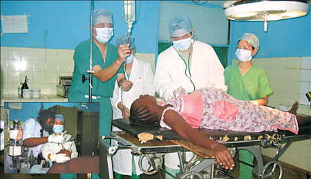 Chinese physicians conduct a medical checkup for a pregnant woman suffering from cerebral malaria in a local hospital in Sikasso, Mali, in this file photo. [China Daily/Zhejiang public health bureau]