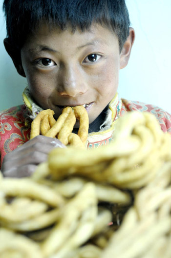A Tibetan boy eats traditional snacks at his house in Longzi county of Shannan prefecture, southwest China's Tibet Autonomous Region, February 21, 2009. [Xinhua]