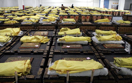People check traditional Chinese musical instrument "fou", or drum, at a pre-auction exhibition in Beijing, capital of China, March 3, 2009. About 1,000 "fou", which were used for performances at the opening ceremony of the 2008 Beijing Olympics, are to be auctioned as the Olympic legacy in Beijing starting from March 8. [Xinhua]