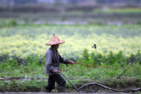 A man ploughs farmland in spite of raining during the spring farming season in Chengtuan Town of Liujiang Councy, south China's Guangxi Zhuang autonomous region, March 3, 2009. [Xinhua]
