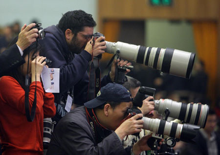 Photographers work at the Second Session of the 11th Chinese People's Political Consultative Conference (CPPCC) in Beijing, March 3, 2009.[Xinhua]
