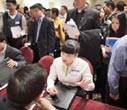 Hu Xiaoyan (C), Zhu Xueqin (R) and Kang Houming, deputies to the first session of the 11th National People's Congress representing the country's migrant population, talk about their proposals to be submitted to the session in Beijing March 4, 2008. [Xinhua]