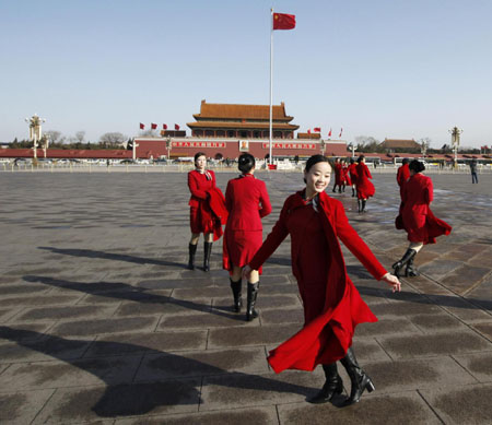 Hostesses enjoy a break in Tian'anmen Square during the opening ceremony of the Second Session of the 11th National People's Congress (NPC) at the Great Hall of the People in Beijing March 5, 2009. [Agencies]