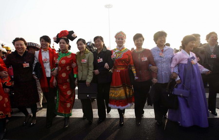 Female delegates walk towards the Great Hall of the People as they arrive for a plenary session of the Chinese People's Political Consultative Conference (CPPCC) in Beijing March 7, 2009. International Women's Day is marked on March 8 every year. [Xinhua]