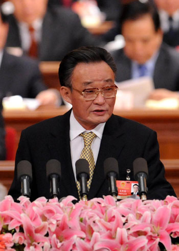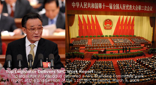 Wu Bangguo, chairman of the Standing Committee of the National People's Congress (NPC), delivers a report on the work of the NPC Standing Committee during the second plenary meeting of the 11th NPC annual session in Beijing, capital of China, March 9, 2009. [Xinhua]