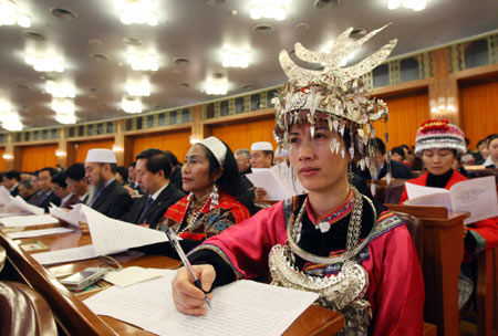 Updated: 2009-03-12 11:58 A CPPCC member from the ethnic groups listens during the closing of the annual session of China's top political advisory body, at the Great Hall of the People in Beijing, March 12, 2009. [Xinhua]