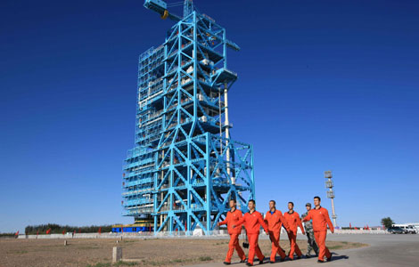 Staff workers march to inject fuel into the Long March-2FT1 carrier rocket at the Jiuquan Satellite Launch Center in Northwest China's Gansu province, Sept 28, 2011. A spokesperson with China's manned space program said Wednesday that fuel has been injected into the carrier rocket in preparation for the launch of the Tiangong-1 space module Thursday evening as planned. [Photo/Xinhua]