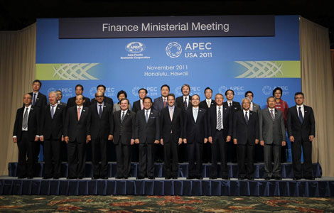 The APEC finance ministers pose for a family photo after the first of their meetings at the APEC Summit in Honolulu, Hawaii, Nov 10, 2011.