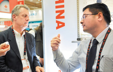 A businessman talks with a Chinese exhibitor at the 2011 International Consumer Electronics Show in Las Vegas, Nevada, in January last year. Zhang Jun / Xinhua |