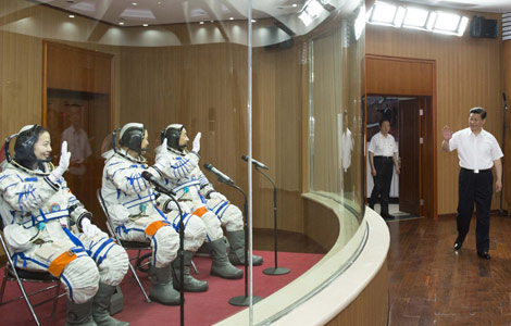 Xi came among space scientists at the command center in Jiuquan, shook hands with those participating in the program and sent his warm greetings to them.