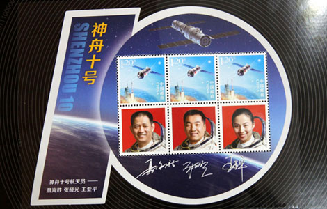Commemorative stamps with the portraits of Nie Haisheng, Zhang Xiaoguang and Wang Yaping are issued at the Jiuquan Satellite Launch Center, Northwest China's Gansu province, June 10, 2013.