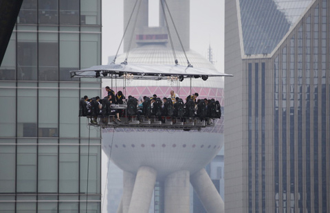 Waiting staff set the table before the first "dinner in the sky" service "takes off." [Photo/IC]