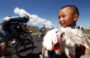 A boy watches the race during the Tour of Qinhai Lake cycling race in Northwest China's Qinghai province, July 20, 2010.