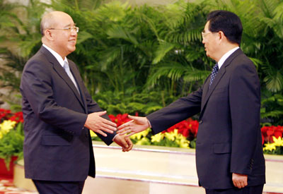 Chen Yunlin, president of the mainland's Association for Relations Across the Taiwan Straits (ARATS), shakes hands with Taiwan leader Ma Ying-jeou (R) during a meeting at the Taipei Guest House in Taipei November 6, 2008.