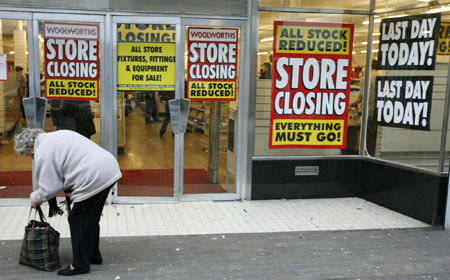 Updated: 2008-12-28 16:12 A shopper attends to her bag outside a branch of the Woolworths store in Altrincham, northern England, December 27, 2008. Administrators began closing the stores of Woolworths, one of Britain's best known retailers, on Saturday. The household name, which sold everything from chocolate bars to toasters and televisions, is the highest profile retail casualty of the global financial crisis and Britain's economic downturn. Woolworths collapsed into administration in November and its administrators said earlier this month all its stores would close by Jan. 5, with the loss of 27,000 jobs, unless a last-minute buyer could be found. [Agencies]