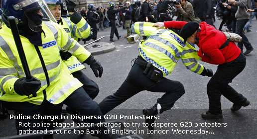 Updated: 2009-04-02 08:09 LONDON – Riot police staged baton charges to try to disperse several hundred protesters gathered around the Bank of England in the heart of London's financial center on Wednesday after a day of protest against the G20 summit.
