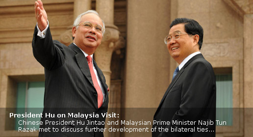 Chinese President Hu Jintao and Malaysian Prime Minister Najib Tun Razak met to discuss further development of the strategic and cooperative ties between China and Malaysia. Hu: Strategic Co-op Benefits Countries, Region China, Malaysia to Enhance Banking Co-op