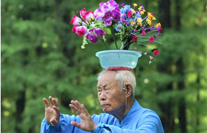 An old man practices Taijiquan (shadowboxing) while he is carrying a pot of artificial flowers on his head in Shanghai People’s Park, June 30, 2010.