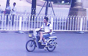 A man is snapped riding an electric bicycle with his legs crossed at Tiananmen Square in Beijing, May 31, 2011.