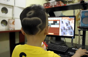 The Apple logo has been shaved into the hair of five-year-old boy Taotao, who plays computer games inside a shop in Qianxiang county, Dongyang city, Zhejiang province.