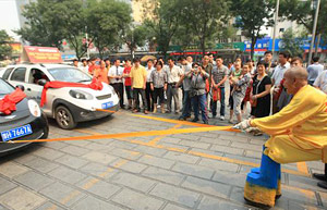 Wu Baoxin, 60, prepares for his performance of pulling two cars with just his fingers at a square in Jiaozuo, Central China's Henan province, June 16, 2011.