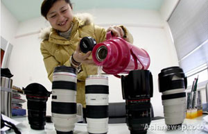 A woman pours water into cups shaped like camera lenses, in Huaibei, East China’s Anhui province, March 1, 2011. The cups are popular among photography enthusiasts on the Internet.