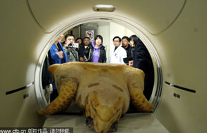 Weighing 70-kilograms, the turtle would only fit through a CT machine with a width of 80 centimeters, the largest one in Hunan province, central China.