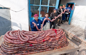 A 213-meter and 1,256-kilogram horse casing sausage is dried in Yining of Northwest China's Xinjiang Uygur autonomous region January 23, 2011.