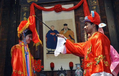 More than 100 foreign students from 26 countries at five universities experienced a Qing-style wedding ceremony in the Huizhou region earlier this week.