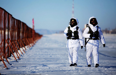 Sentinels Xin Guoqiang and Xue Yanjun from Heihe's Eighth company patrol at the China-Russia border in Heihe city, Northeast China's Heilongjiang province on Jan 15, 2015.