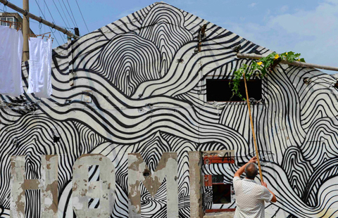 A house is painted with zebra stripes in Shanghai, Sept 11, 2014.