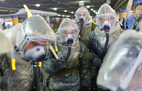Members of a delegation of senior officials from China take part in a chemical warfare drill in Shaare Zedek Medical Center in Jerusalem September 15, 2014.