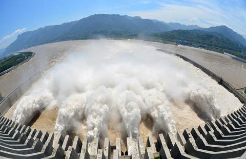 Flood water is discharged through the sluice gate of the Three Gorges Dam on Wednesday. The reservoir saw its biggest flood peak this year a day earlier leading to the discharge.